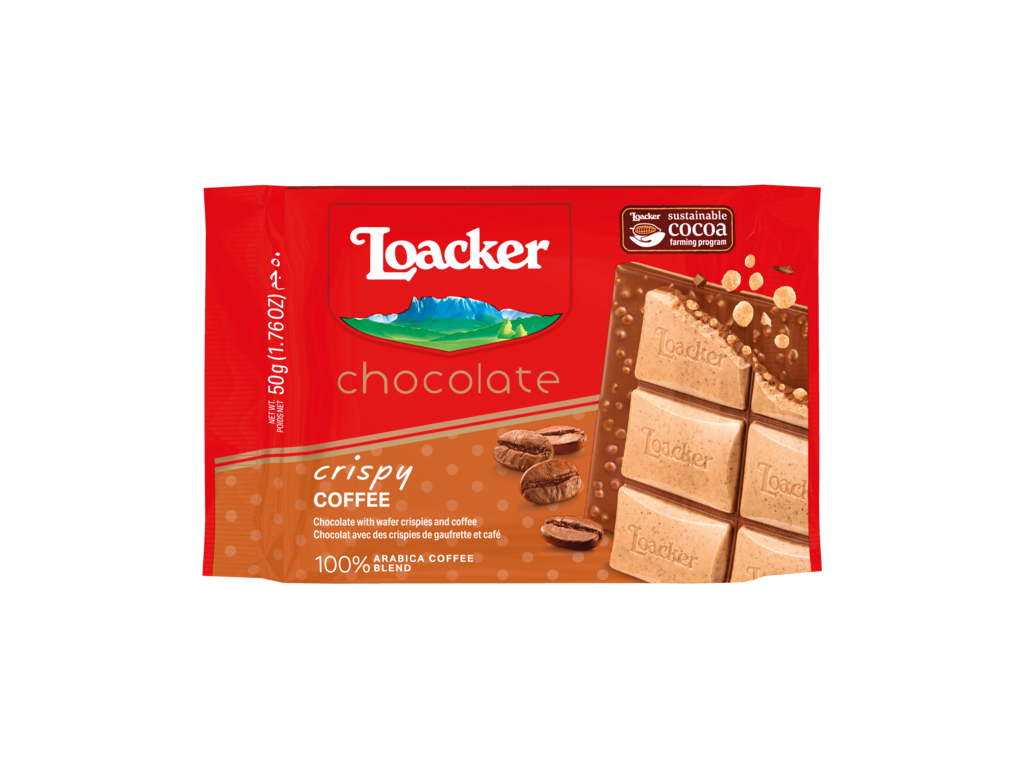 LOACKER BARRA CRISPY CARAMEL 50G, para os amantes de café esse e o chocolate perfeito !! Deliciosa barra de chocolate ao leite com pedacinhos de café e crispes de wafer crocantes. O equilíbrio perfeito que derrete na boca.