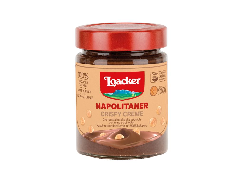 LOACKER CREME CROCANTE NPOLITANER 270G, uma delícia maravilhosa que contém não só o nosso delicioso recheio de creme de avelã 100% italiano, mas também as crocantes lascas de wafer que a tornam única no mercado. Abra o frasco e deixe-se levar pelo aroma intenso das requintadas avelãs italianas, lindamente torradas. Depois, mergulhe a colher e saboreie o momento: você será conquistado por uma nova e fascinante experiência.